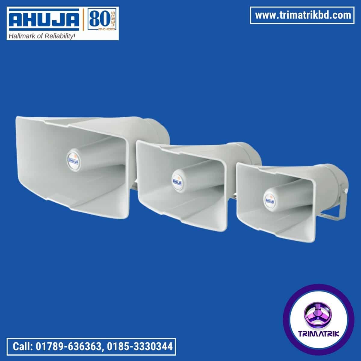 - Ahuja high quality, weather proof horn speakers are compact, light weight and rugged. They are moulded in tough UV protected ABS plastic for longer lasting finish. The specifications and construction of these are similar to the low impedance horn speakers. These models have been provided with 100V line matching transformers with multiple taps/impedance easily selectable by changing the position of the rotary switch at the rear of the sealed assembly. These 100V models are ideal for installations where long speaker cables are used, to avoid power loss in the cables.